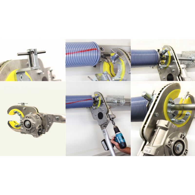 Strumento destinato a professionisti qualificati per il tensionamento delle molle a torsione delle porte sezionali industriali, riduce al minimo lo sforzo fisico per installatori, manutentori e tecnici dei portoni sezionali.